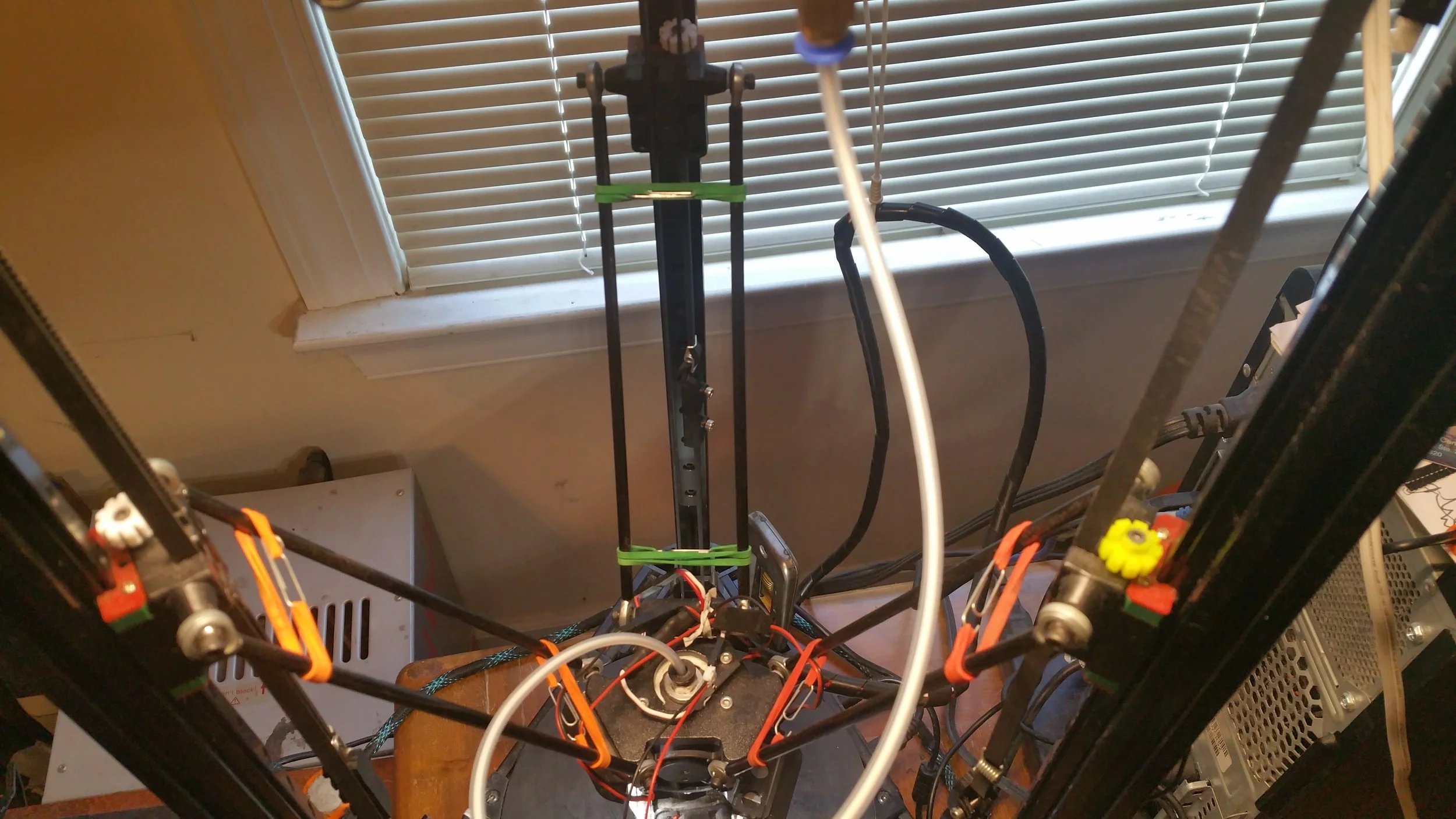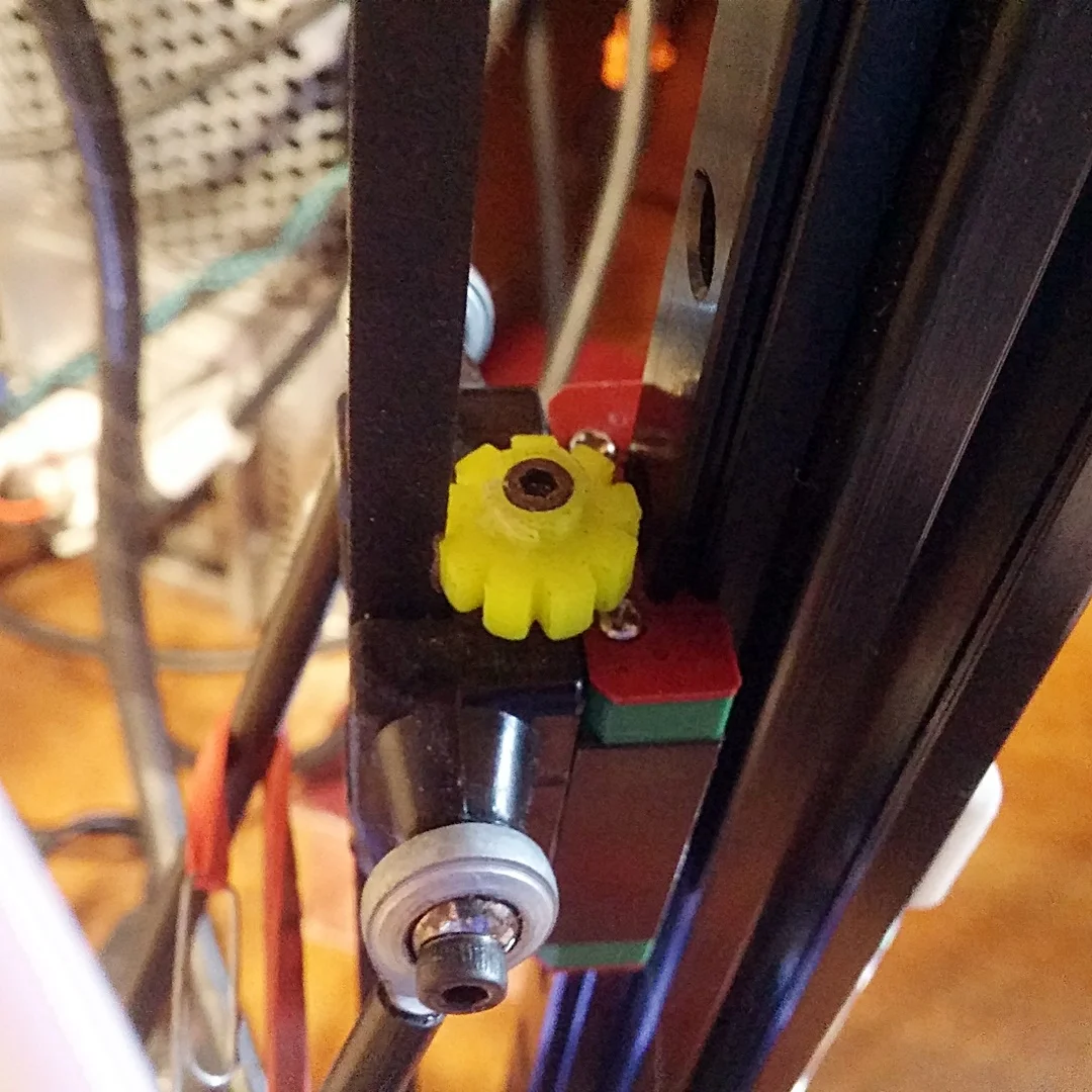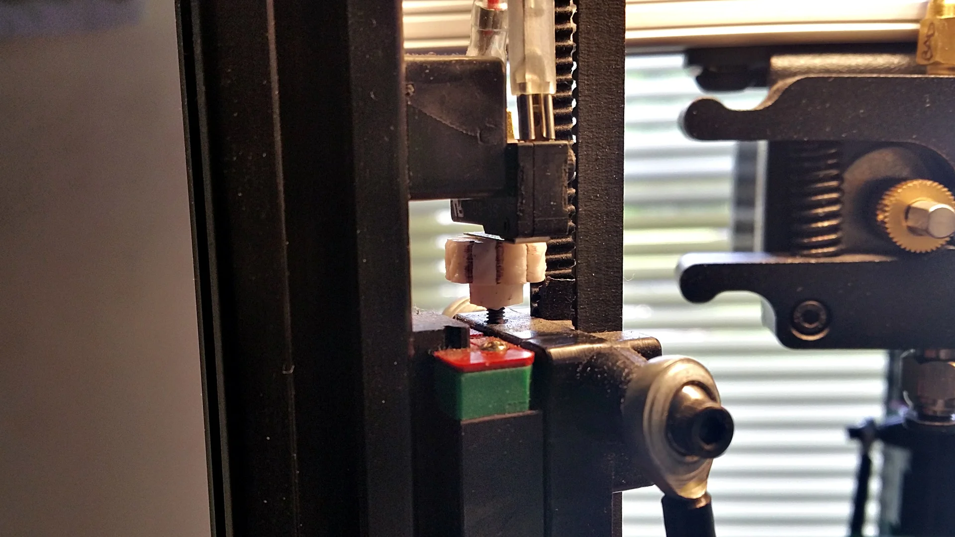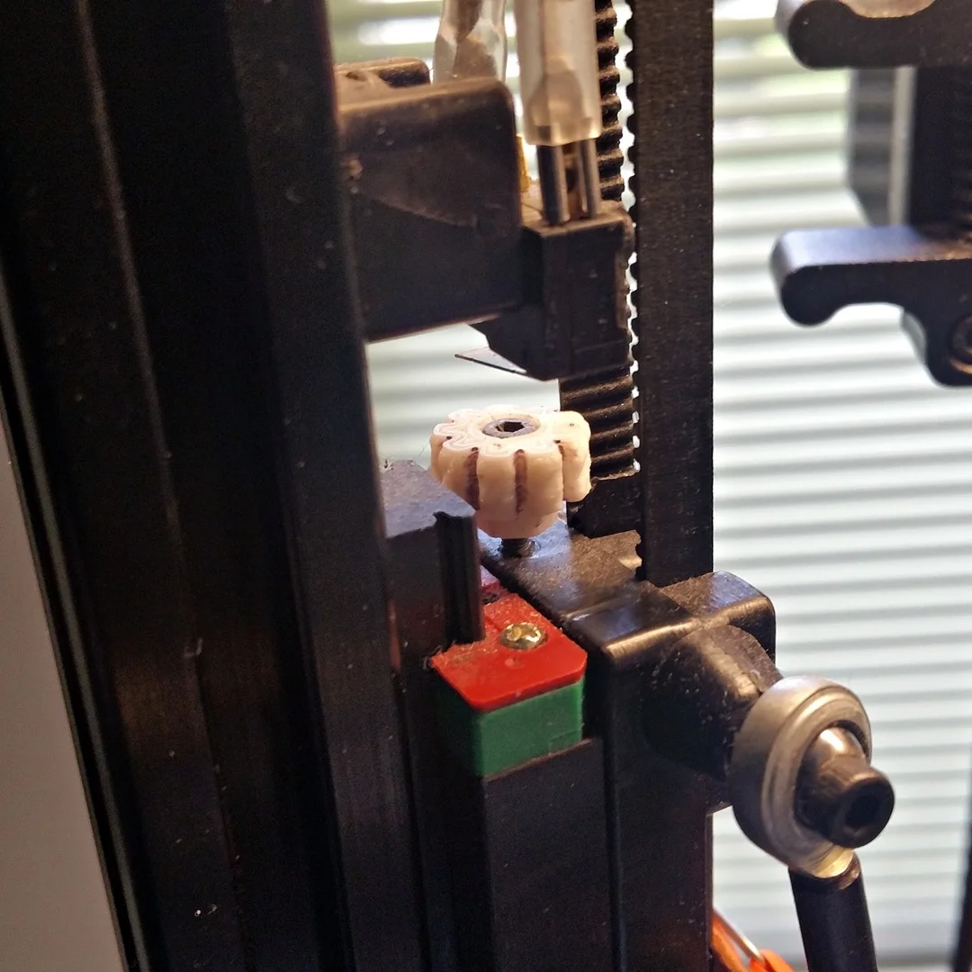 The cool part is, M2.5 screws have a thread pitch of 0.45mm/mm, so I designed these knobs with 9 notches which index off the fixed timing belt, running next to the screw. This means, turning the thumbscrew 1 notch = 0.05mm of adjustment. Follow the right hand rule for up or down and no more tools.